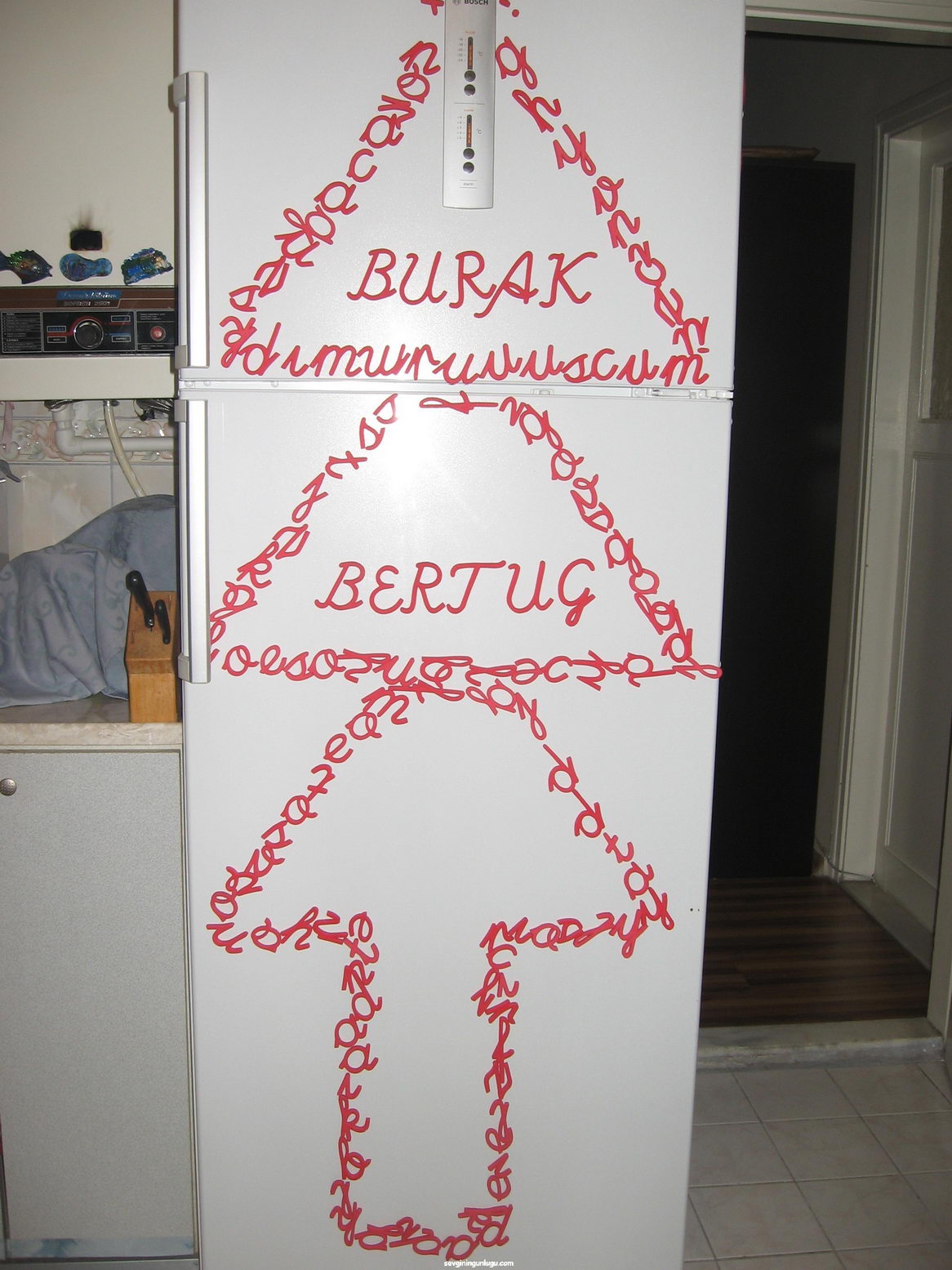 Oğlum birinci sınıfa gittiği için diğer harfleri de çabuk öğrenmesi amacıyla bu mıknatıslı harfleri dolabımıza yapıştırdık. Her gün söylediğimiz kelimeleri yazıyor, bozuyor derken her öğrendiği kelimede  daha da bir mutlu oluyordu. Yaklaşan yeni yılla birlikte böyle bir fikir ortaya attım ve oğlumla beraber bu ağacı yaptık, kardeşinin ve kendisinin ismini de o yazdı. Böylece mutfağımızda da kocaman bir ağacımız olmuş oldu…