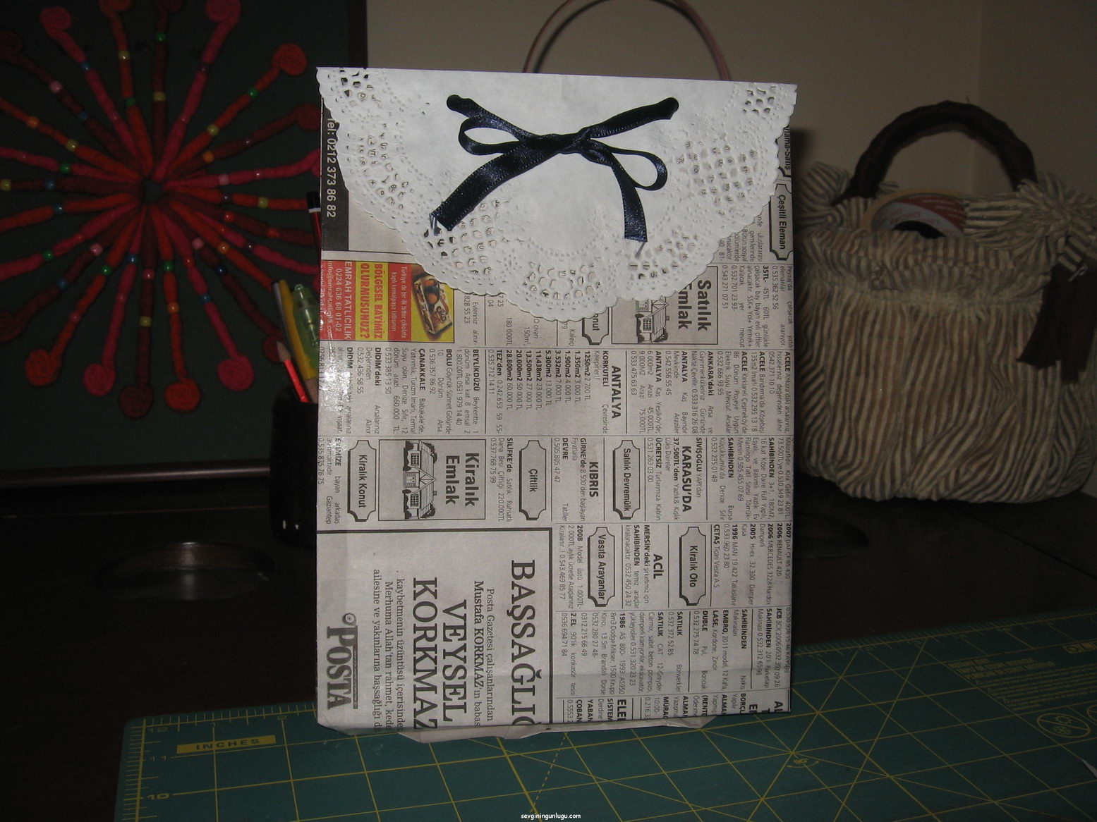 Değişik hediye paketi sunumlarına bayılırım. İşte bunlardan bir tanesini burada gördüm ve hemen gazeteliğe el attım. İlki birazcık dar olsa da, değerlendiririm düşüncesiyle atmadım, gün gelir ihtiyaç duyabilirim.İkincisi daha bir geniş yaptım ve içine yaptığım kuş evimi ve yeni yıl kurabiyelerimi de koyarak şık bir keçe çanta ile İstanbul’a uçurdum.